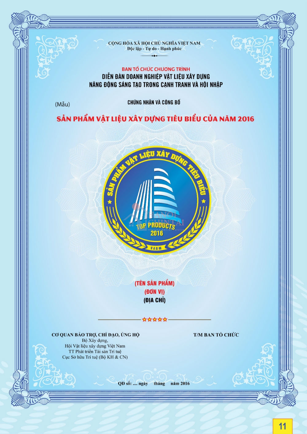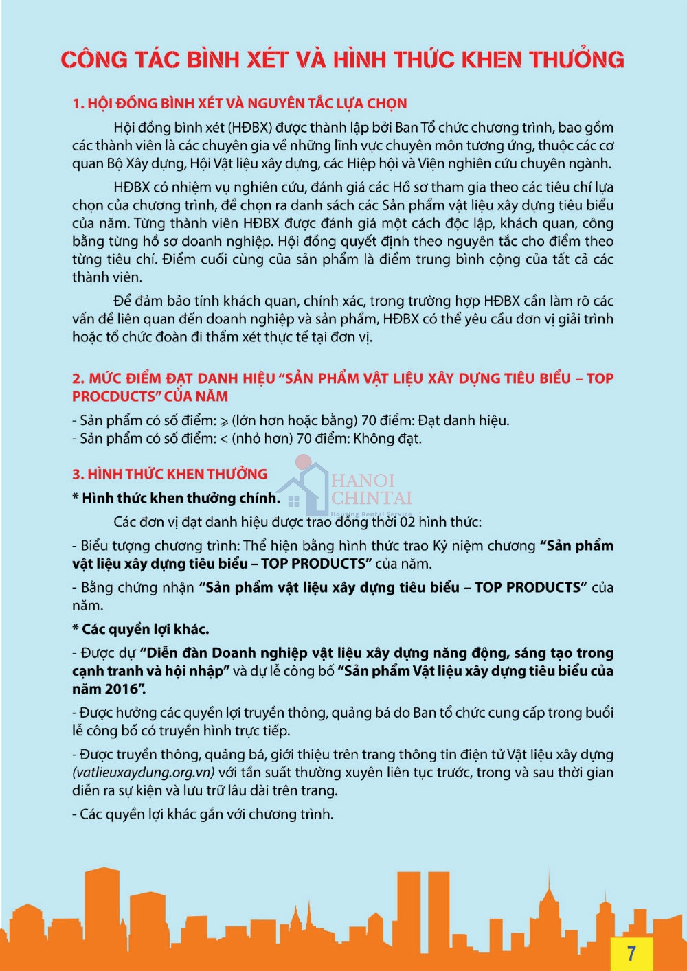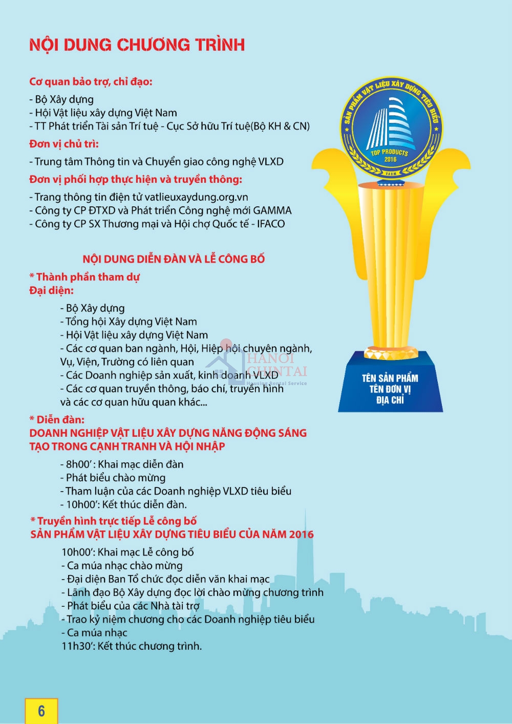 Chương trình sẽ diễn ra vào đầu tháng 12/2016 do Trung tâm Thông tin và Chuyển giao Công nghệ VLXD - Hội Vật liệu xây dựng Việt Nam tổ chức nhằm mục đích ghi nhận các thành tựu của các doanh nghiệp trong ngành VLXD đã đạt được, đồng thời biểu dương sức mạnh trí tuệ, tâm huyết, sự năng động của doanh nghiệp, doanh nhân trong ngành... qua đó động viên, khuyến khích các doanh nghiệp, doanh nhân tích cực phát triển sản xuất, sẵn sàng trong cạnh tranh và hội nhập quốc tế.