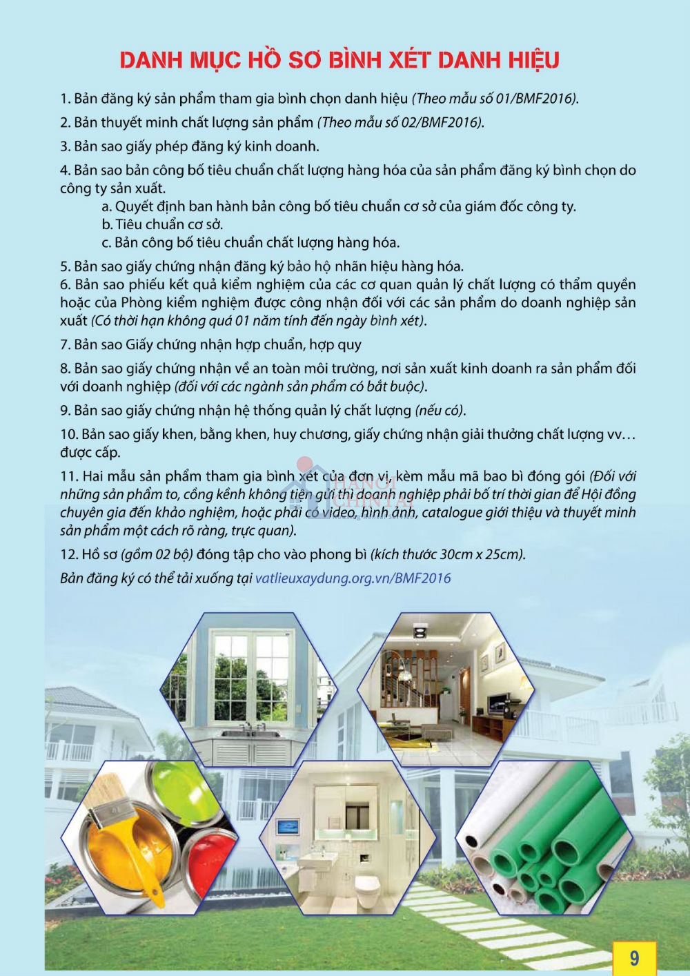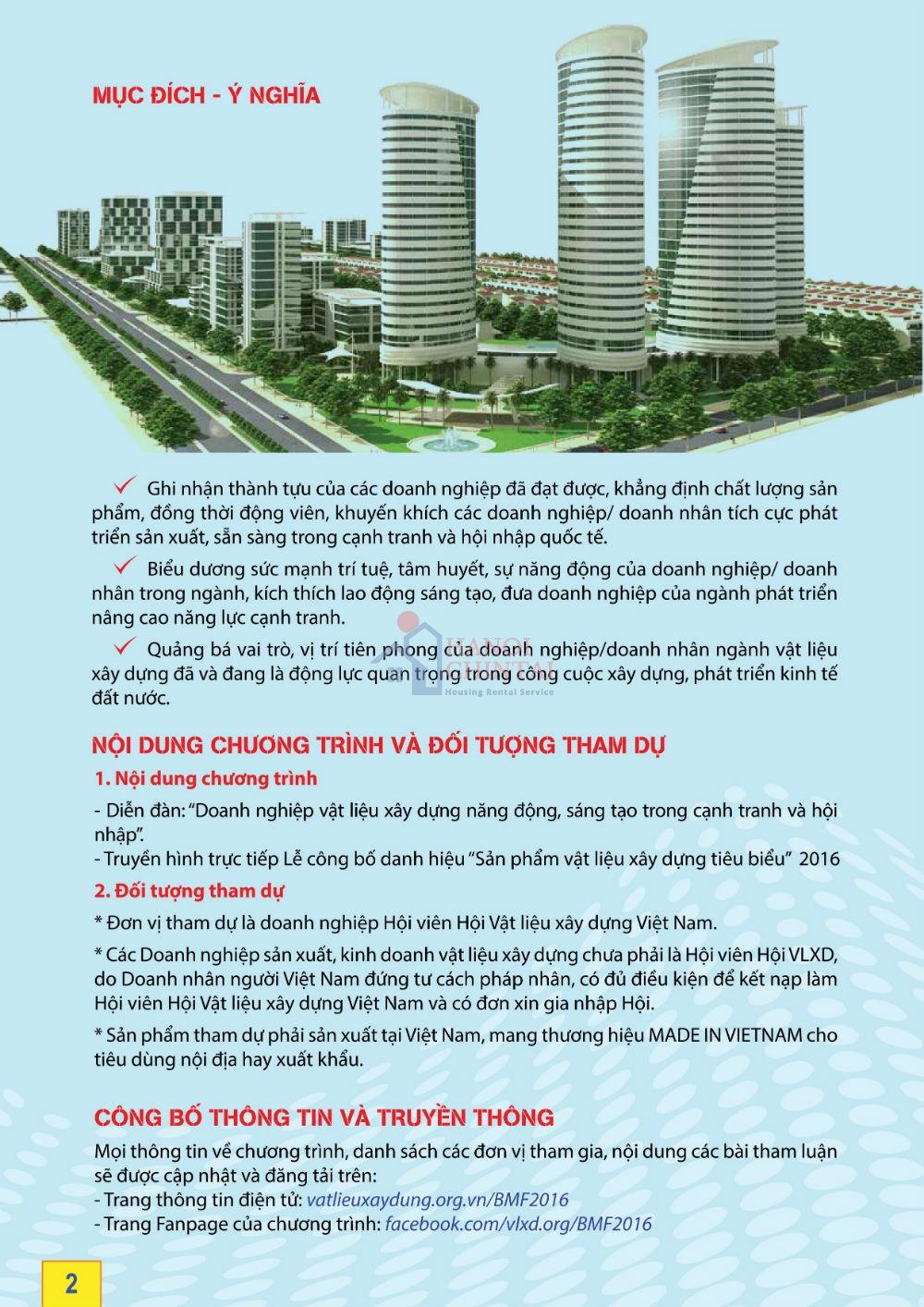 Để Chương trình diễn ra được thành công và trở thành sự kiện thường niên của ngành VLXD Việt Nam, Ban Tổ chức Chương trình BMF 2016 rất mong nhận được sự tham gia của các doanh nghiệp Hội viên Hội VLXD Việt Nam; các doanh nghiệp sản xuất, kinh doanh vật liệu xây dựng chưa phải là Hội viên Hội VLXD, do doanh nhân người Việt Nam đứng tư cách pháp nhân, có đủ điều kiện để kết nạp làm Hội viên Hội VLXD Việt Nam và có đơn xin gia nhập Hội.