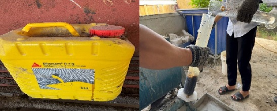 Trong nghiên cứu này, hỗn hợp bê tông được thiết kế theo cấp phối sử dụng cho BTXM, kết hợp PGHH nhằm kiểm soát hiệu quả tỷ lệ N/CKD, đặc biệt trong trường hợp có sử dụng TB. Do hạt TB có diện tích bề mặt riêng lớn nên có xu hướng làm giảm độ sụt của bê tông. Loại phụ gia được dùng là Sikament® R-7 N, có tác dụng giảm nước đồng thời kéo dài thời gian ninh kết của xi măng và giúp cải thiện tính công tác của hỗn hợp, thể hiện ở Hình 2.