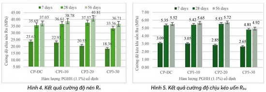- Ở tuổi 56 ngày, phản ứng pozzolan của TB đã phát huy rõ rệt, góp phần bù đắp lượng xi măng thay thế, giúp cường độ nén đạt từ 99,14 đến 104,73% và cường độ kéo uốn đạt từ 89,13 đến 102,36% so với mẫu đối chứng.
