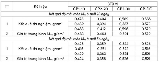 Kết quả thí nghiệm độ mài mòn của BTXM được thể hiện ở Bảng 6.