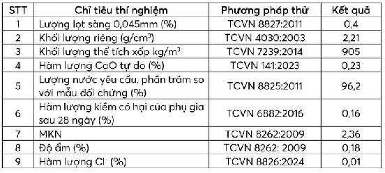 Kết quả thể hiện như: Độ hút nước: 0,48%, khối lượng thể tích xốp: 1,613 g/cm3, khối lượng riêng: 2,785 g/cm3, hàm lượng chung bụi, bùn, sét: 0,36%.