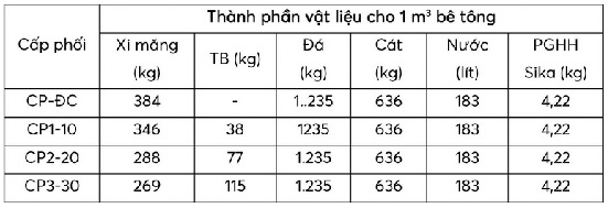Chỉ thay đổi thành phần chất kết dính bằng cách dùng lần lượt: 0%; 15%; 25% và 35% TB (theo khối lượng) thay thế xi măng. Tỷ lệ nước trên chất kết dính (N/CKD) được giữ ổn định ở 0,48 cho tất cả các cấp phối. Các cấp phối trong hỗn hợp BTXM được trình bày trong Bảng 3.