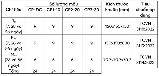 Mỗi tổ hợp BTXM được chế tạo 24 mẫu nhằm phục vụ các thí nghiệm xác định tính chất cơ học. Tổng hợp số lượng mẫu thí nghiệm được trình bày trong Bảng 4.