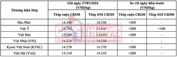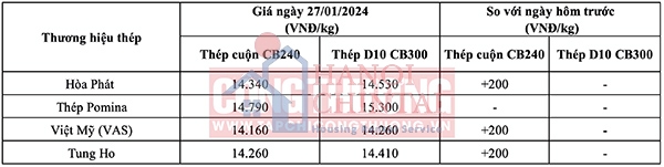 Giá thép ngày 27/1/2024 tại miền Bắc. (Nguồn: Steel Online)