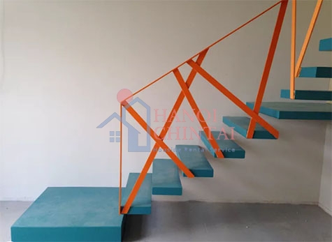 Khác với những chiếc cầu thang giữ nguyên màu bê tông xám tự nhiên, chiếc cầu thang này sử dụng hai tông màu tương phản trên vòng tròn đơn sắc là xanh biển và cam nóng để thổi hơi thở đầy sức sống đến cho căn nhà.