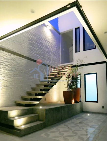 Chiếc cầu thang nổi với các bậc thang cách nhau như trên hình nên được phối hợp cùng bệ cầu thang dày hình khối chữ nhật để tạo cảm giác chắc chắn và tính liên kết.