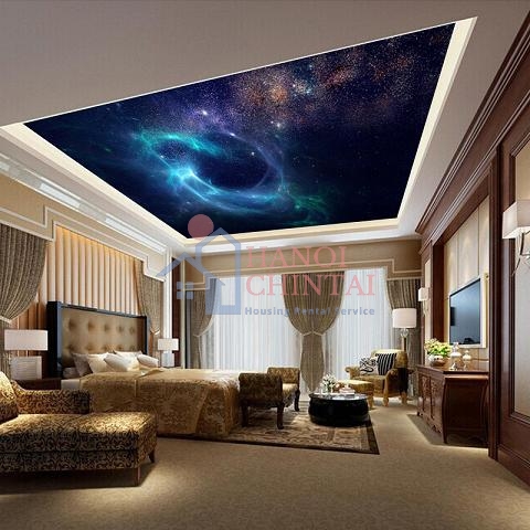 Không gian phòng ngủ sang trọng kết hợp thêm trần nhà galaxy 3D với hình ảnh vũ trụ như các rải cát bay lượn phát sáng trong gió.