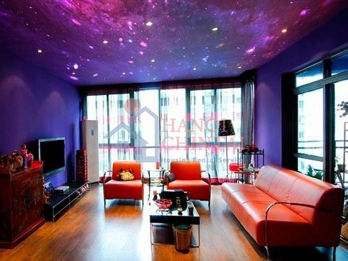 Phông tường màu tím kết hợp với ghế sofa da màu cam rất ăn khớp với trần nhà 3D màu tím galaxy.