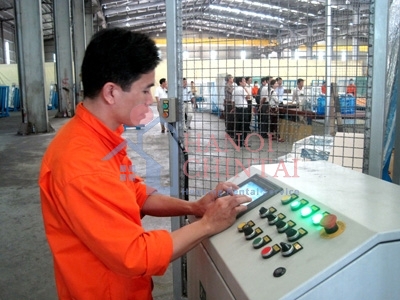 Công nhân VIGLACERA đang vận hành dây chuyền sản xuất kính.