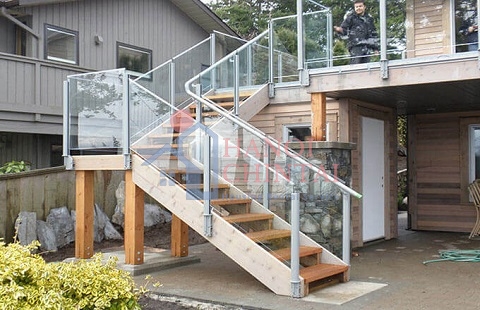 Thiết kế cầu thang ngoài trời này có dạng chữ L, chất liệu thang bằng gỗ, lan can bằng kính chịu lực và tay vịn bằng inox. Tất cả điều này tạo nên một chiếc cầu thang vô cùng chắc chắn và ấn tượng, nhìn là mê.