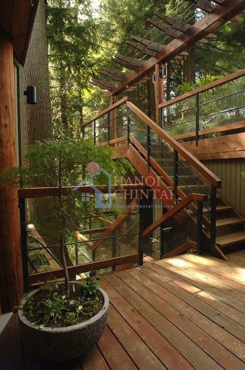 Cầu thang gỗ ngoài trời tuy không thể bền bỉ như những loại vật liệu khác nhưng nó mang lại một vẻ đẹp rất riêng. Bạn có thể kết hợp gỗ với những vật liệu khác như dây thừng, sắt thép và các tấm kính.