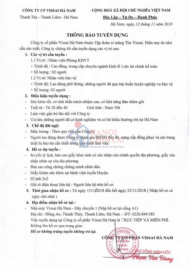 AaTuyển dụng nhân sự làm việc tại nhà máy Xi măng Vissai Hà Nam2050|16:18 - 16/11/2018Tuyển dụng nhân sự làm việc tại nhà máy Xi măng Vissai Hà NamCông ty CP Vissai Hà Nam thuộc Tập đoàn Xi măng The Vissai, hiện nay do nhu cầu sản xuất, Công ty cần tuyển dụng một số vị trí sau. VLXD.org (TH/ Vissai Hà Nam)