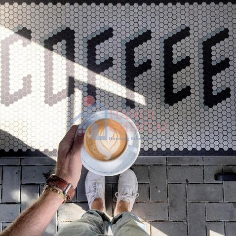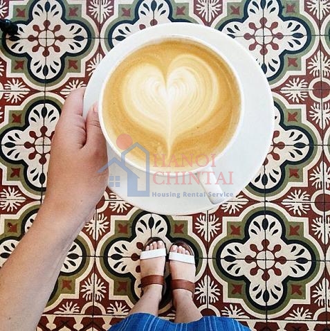 Cà phê, giày đẹp và không thể thiếu bức nền gạch bông xanh nổi bật. Mỗi ô gạch đều mang họa tiết khác nhau nhưng rất hài hòa vì cùng mang sắc màu tương ứng