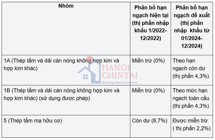 Đối với Việt Nam, các điều chỉnh về phân bổ hạn ngạch sẽ ảnh hưởng đến các nhóm sản phẩm thép như thép tấm và dải cán nóng (nhóm 1A, 1B) và thép tấm mạ hữu cơ (nhóm 5), như thể hiện trong bảng phân bổ hạn ngạch kèm theo.