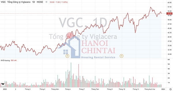 Khối lượng giao dịch và xu hướng giá cổ phiếu VGC của Viglacera từ đầu năm 2023 đến nay. (Nguồn: TradingView)
