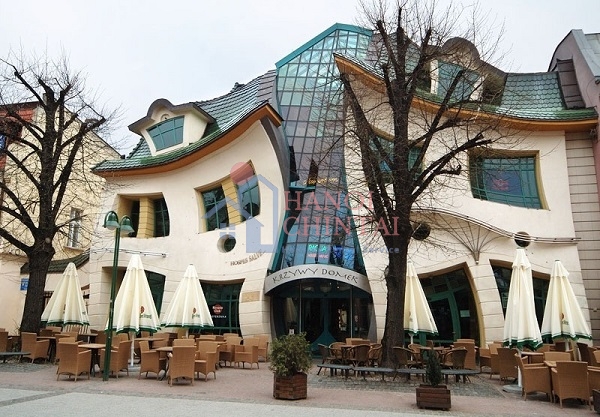 Tòa nhà vẹo là một phần của trung tâm mua sắm ở thành phố Sopot của Ba Lan. Hình dạng méo mó của Crooked House được lấy cảm hứng từ những bức tranh minh họa trong truyện cổ tích của Jan Marcin Szancer và được thiết kế bởi kiến trúc sư Szotyńscy & Zaleski. Tòa nhà nằm trong khu nghỉ mát bên bờ biển Sopot của Ba Lan trên Biển Baltic gần Gdansk. Được hình thành như một tòa nhà đa năng, nó bao gồm các cửa hàng, quán bar, nhà hàng, trung tâm y tế cũng như không gian văn phòng. Krzywy Domek kết hợp kinh doanh với văn hóa và nghệ thuật. Các câu lạc bộ và quán rượu đảm bảo rằng tòa nhà là một nơi không bao giờ ngủ. Không có gì lạ, vì nó tạo cho người xem cảm giác như đang say.
