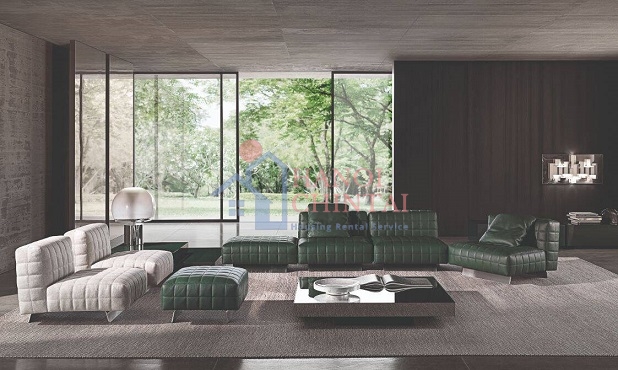 Ghế sofa Minotti Twiggy của Rodolfo Dordoni với gam màu xanh lá cây đậm tạo điểm nhấn ấn tượng cho phòng khách