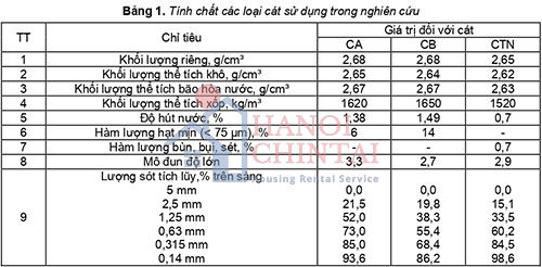 Trong nghiên cứu đã sử dụng xi măng poóc lăng hỗn hợp PCB40 của Nhà máy Xi măng Hoàng Thạch có khối lượng riêng bằng 3,09 g/cm³, lượng nước tiêu chuẩn 31%, thời gian bắt đầu đông kết 120 phút, thời gian kết thúc đông kết 210 phút và cường độ chịu nén ở 3 ngày và 28 ngày tuổi tương ứng bằng 22,3 MPa và 43,7 MPa. Cốt liệu lớn là đá dăm có khối lượng thể tích khô bằng 2,64 g/cm³, khối lượng thể tích xốp 1400 kg/m³, độ nén dập 7%, hàm lượng hạt thoi dẹt 9%, có lượng sót sàng tích lũy trên sàng 40 mm, 20 mm, 10 mm và 5 mm tương ứng bằng 0,0%; 8,7%; 60,8% và 97,3%. Trong nghiên cứu này, đã lựa chọn sử dụng hai loại cát nghiền nguồn gốc cacbonat với tỷ lệ hạt mịn khác nhau là CA và CB với các tính chất được trình bày trong bảng 1. Ngoài ra, các thí nghiệm đối chứng cũng được tiến hành với mẫu cát tự nhiên là cát sông Lô (ký hiệu CTN).