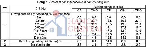 Kết quả thu được tại bảng 2 cho thấy, lượng sót trên các sàng sau khi loại bỏ hạt mịn có sự thay đổi đáng kể. Tuy nhiên, trong khi lượng sót trên các sàng 2,5 mm, 1,25 mm và 0,63 mm có xu hướng tăng khi loại bỏ các hạt mịn thì ngược lại, lượng sót trên các sàng nhỏ hơn là 0,315 mm, 0,14 mm và đáy sàng lại có xu hướng giảm.