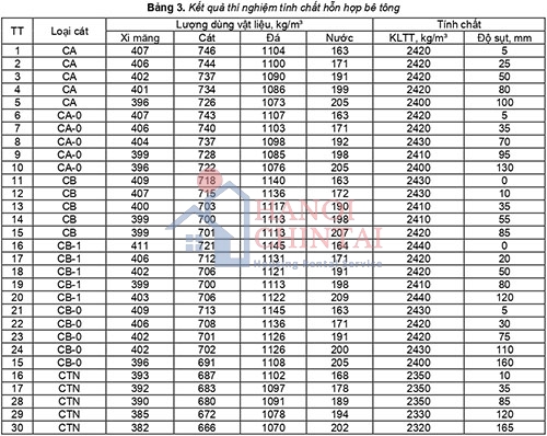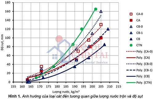 Để nghiên cứu ảnh hưởng của hàm lượng cát mịn đến độ sụt của hỗn hợp bê tông, đã tiến hành trộn và thí nghiệm các mẻ bê tông với các loại cát nghiền khác nhau. Lượng dùng xi măng trong các cấp phối được lấy cố định bằng 400 kg/m³. Lượng dùng vật liệu cho cấp phối ban đầu được tính toán theo TCVN 9382:2012. Với các cấp phối tiếp theo, giữ nguyên lượng dùng vật liệu khô, tăng dần lượng nước trộn để khảo sát ảnh hưởng của lượng nước tới độ sụt. Cấp phối bê tông thực tế được tính toán lại theo khối lượng thể tích thực của hỗn hợp bê tông. Các thí nghiệm trên được tiến hành với hai loại cát nghiền ban đầu (CA, CB), ba loại cát nghiền qua sàng ướt (CA-0, CB1, CB-0) và cát tự nhiên sông Lô (CTN). Kết quả xác định quan hệ giữa lượng dùng nước và độ sụt của hỗn hợp bê tông được trình bày tại bảng 3 và hình 1.