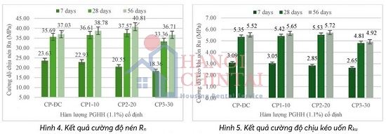 - Ở tuổi 56 ngày, phản ứng pozzolan của TB đã phát huy rõ rệt, góp phần bù đắp lượng xi măng thay thế, giúp cường độ nén đạt từ 99,14 đến 104,73% và cường độ kéo uốn đạt từ 89,13 đến 102,36% so với mẫu đối chứng.