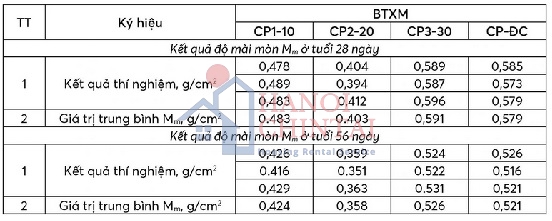Kết quả thí nghiệm độ mài mòn của BTXM được thể hiện ở Bảng 6.