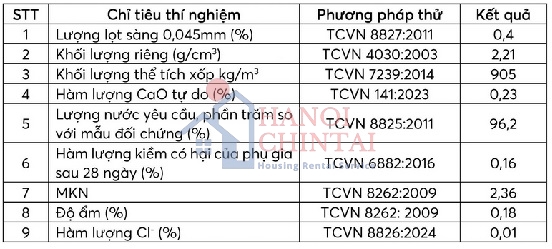 Kết quả thể hiện như: Độ hút nước: 0,48%, khối lượng thể tích xốp: 1,613 g/cm3, khối lượng riêng: 2,785 g/cm3, hàm lượng chung bụi, bùn, sét: 0,36%.