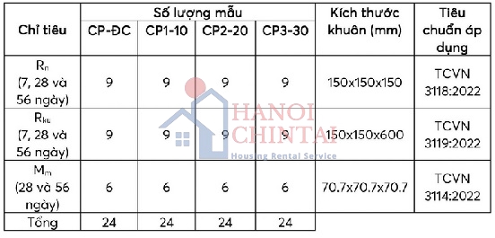 Mỗi tổ hợp BTXM được chế tạo 24 mẫu nhằm phục vụ các thí nghiệm xác định tính chất cơ học. Tổng hợp số lượng mẫu thí nghiệm được trình bày trong Bảng 4.