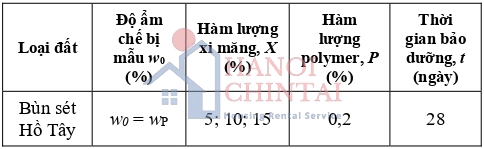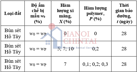 Bùn sét tự nhiên từ Hồ Tây sau khi tách nước bằng lắng trọng lực có độ ẩm cao, giá trị trung bình: W=201,3%, WL=87,9%, WP=55,6%. Thí nghiệm nén một trục nở hông được tiến hành với các cấp phối như sau: Bùn: 100%, Polymer: 0,2%, ứng với 9 loại xi măng PCB phổ biến ở địa phương với hàm lượng là: (5; 10; 15)% (Bảng 2). Thí nghiệm SEM được thực hiện với mẫu bùn tự nhiên, sau đó tiến hành giữ nguyên hàm lượng P=0,2% và thay đổi hàm lượng xi măng X=(5; 7; 10)% để quan sát sự thay đổi cấu trúc do ảnh hưởng của hàm lượng xi măng; đồng thời giữ nguyên hàm lượng X=10% và thay đổi hàm lượng P=(0,1; 0,2)% để quan sát sự thay đổi cấu trúc do ảnh hưởng của hàm lượng polymer (Bảng 3).