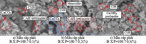 Cấu trúc các thành phần có trong vật liệu VSL được thể hiện rõ trong hình ảnh SEM ở độ phóng đại lớn 3000 lần. Các hình ảnh cho thấy trong các mẫu VSL chứa các thành phần của quá trình thủy hóa xi măng, đó là: CSH xuất hiện nhiều ở tất cả các mẫu, tồn tại ở dạng gel, kết bông lại từng chùm; CAH còn gọi là ettringite có dạng que hình thoi, xuất hiện ít hơn như trên Hình 14c, 15a, 15b; lượng CSH, CAH tăng lên đáng kể khi tăng hàm lượng xi măng, các sản phẩm này kết bông trên bề mặt mẫu VSL, các sản phẩm CSH đan xen liên kết nhau giống như tổ ong tạo nên kết cấu vững chắc của vật liệu VSL; một số hình ảnh bề mặt còn xuất hiện các tinh thể rắn màu trắng canxít (CaCO3) như trên Hình 14b, 15a, 15b. Hình 15b xuất hiện các tinh thể tấm mỏng hình lục giác được cho là monosulfat, là sản phẩm của một phần ettringite tác dụng với thạch cao tự do (CaSO4.2H2O) có trong hỗn hợp [16]. Hình 15c cho thấy sản phẩm Ca(OH)2 còn gọi là portlandite xuất hiện ở dạng pha rắn có dạng khối đa giác đều chiếm chủ yếu trên bề mặt mẫu.Thông qua hình SEM ở độ phóng đại thấp 50 lần và 200 lần cho thấy sự phát triển cấu trúc đặc trắc hơn theo tỷ lệ hàm lượng xi măng và polymer; đồng thời ở độ phóng đại cao 3000 lần thấy được sự hình thành, phát triển các sản phẩm của quá trình thủy hóa xi măng, khi tỷ lệ xi măng càng cao thì sản phẩm thủy hóa càng nhiều, đặc biệt các sản phẩm CSH, CAH chiếm phần lớn, có kết cấu bông/tổ ong góp phần tạo nên cấu trúc vững chắc làm gia tăng cường độ của mẫu. Các hình ảnh SEM của các mẫu VSL với các cấp phối khác nhau minh chứng rõ rệt cho sự tương đồng giữa sự phát triển cấu trúc vi mô với sự phát triển cường độ của mẫu.