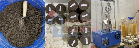Thí nghiệm nén 1 trục nở hông được tiến hành trên máy nén 1 trục tốc độ 1,27mm/phút. Mẫu bùn sau khi nạo vét được tách nước bằng phương pháp lắng trọng lực đến độ ẩm giới hạn dẻo wP, tiến hành trộn bằng phương pháp thủ công các cấp phối mẫu như ở Bảng 2, Bảng 3. Sau khi xi măng thủy hóa hoàn toàn, tiến hành đúc mẫu và bảo quản trong thùng xốp kín, đến 28 ngày tuổi mẫu thực hiện nén mẫu như Hình 7 [11].