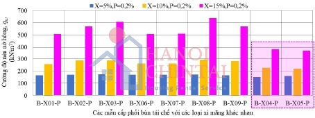 Hình 10 thể hiện ảnh hưởng của loại xi măng đến cường độ nén một trục nở hông của vật liệu VSL ứng với từng loại xi măng với các cấp phối khác nhau. Có 3 cấp phối bùn, xi măng, polymer (B:X:P)=(100:5:0,2)%, (100:10:0,2)%, (100:15:0,2)% tương ứng với 9 loại xi măng địa phương được mã hóa từ X01 đến X09. Kết quả cho thấy, cường độ của mẫu VSL gần như không thay đổi khi hàm lượng xi măng dưới 5%, giá trị cường độ cũng không phụ thuộc vào loại xi măng, tức là không phụ thuộc vào các thành phần hóa học trong xi măng, điều này được lý giải do hàm lượng xi măng quá nhỏ, không đảm bảo sự phát triển cường độ cần thiết của đất, kết luận trên cũng phù hợp với các nghiên cứu của Kiazume và cộng sự [7]. Khi hàm lượng xi măng lớn hơn 5% (từ 10 - 15%) thì cường độ của vật liệu VSL có sự thay đổi đáng kể tùy thuộc vào loại xi măng. Hàm lượng CaO trong xi măng càng cao thì cường độ vật liệu VSL càng giảm và ngược lại, thể hiện ở các mẫu xi măng X03, X08, X04, X05 do khi hàm lượng CaO lớn, một phần CaO tham gia vào quá trình thủy hóa xi măng, phần còn lại sẽ tồn tại ở dạng CaO tự do kém ổn định về thể tích làm cường độ đất giảm; hàm lượng Al2O3, SO3 trong xi măng càng lớn thì cường độ của vật liệu VSL càng cao, thể hiện ở các mẫu xi măng X02, X03, X08, X09, điều này được lý giải do hình thành các sản phẩm của quá trình thủy hóa xi măng làm cho cấu trúc của đất trở nên đặc chắc hơn giúp tăng cường độ của đất. Điều này cũng được Kitazume và cộng sự làm rõ ở các kết quả nghiên cứu trên các mẫu đất sét nạo vét tại Nhật Bản có wL là 60,7%, wP là 29,1% và Ip là 31%, cho thấy hàm lượng CaO, SO3, Al2O3 trong xi măng có ảnh hưởng lớn đến sự phát triển cường độ của đất. Trong đó cường độ của đất giảm mạnh khi hàm lượng CaO tăng lên và cường độ không thay đổi khi lượng phụ gia khoảng 80 kg/m³. Cường độ của đất gần như không đổi nếu hàm lượng SO3 trong phụ gia thấp hơn 9%, chỉ cần hàm lượng SO3 tăng lên 9% thì cường độ của đất tăng lên nhanh chóng; cường độ của đất gần như không đổi với bất kể hàm lượng Al2O3 khi lượng phụ gia khoảng 80 kg/m³, khi lượng phụ gia được tăng lên 140 và 200 kg/m³, cường độ tăng gần như tuyến tính với hàm lượng Al2O3 [7].