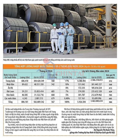Lượng thép HRC nhập khẩu 6 tháng đầu năm vẫn tiếp tục tăng mạnh, gấp 1,7 lần sản xuất trong nước là điều đáng báo động. Tính riêng tháng 6/2024, Việt Nam nhập khẩu 886.000 tấn thép HRC, bằng 151% sản xuất trong nước, trong đó, lượng thép nhập từ Trung Quốc chiếm 77%.