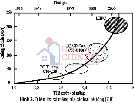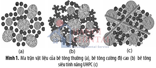 Hình 1 minh họa ma trận vật liệu của các loại bê tông thường, bê tông cường độ cao và bê tông siêu tính năng UHPC [3]. Hỗn hợp của UHPC không bao gồm các hạt cốt liệu lớn, được phát triển bằng cách sử dụng cốt liệu mịn với kích thước tối đa là 0,6 mm [4]. Hình 2 so sánh tỉ lệ nước trên xi măng (N/X) của bê tông UHPC so với bê tông thường và bê tông cường độ cao. Bê tông thường có tỉ lệ N/X lên đến 0,6 trong khi tỉ lệ này ở bê tông cường độ cao khoảng từ 0,4 đến 0,3. Với UHPC, tỉ lệ N/X giảm xuống nhỏ hơn 0,25. Việc đa dạng thành phần hạt với nhiều loại đường kính khác nhau kết hợp với tỉ lệ nước trên xi măng rất thấp giúp tăng cường độ đặc chắc của ma trận vật liệu. Độ xốp của bê tông thường là khoảng 10% [5], giá trị này với UHPC có thể giảm xuống 1,43% [6].