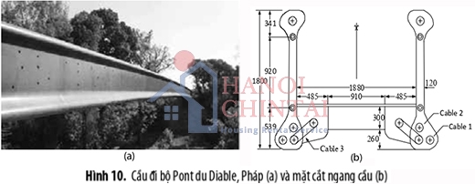 Tại Pháp, việc ứng dụng UHPC vào xây dựng các kết cấu nhịp lớn cũng được triển khai từ sớm. Năm 2005, cầu đi bộ Pont du Diable bắc qua hẻm núi gần Montpellier, Pháp [17] đã được xây dựng (Hình 10a). Mặt cắt ngang cầu gồm hai dầm hình xương cao 1,8 m với bản bụng dày 120 mm (Hình 10b). Các dầm cầu đóng vai trò vừa là bộ phận chịu lực chính vừa có chức năng như lan can bảo vệ. Có 15 đoạn đúc sẵn dài 4,6 m tương đồng tạo nên kết cấu với tổng chiều dài gần 70m.
