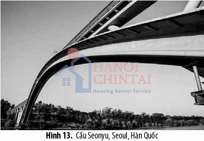 Tại Hàn Quốc, dự án xây dựng cầu Seonyu, Seoul [22] là dự án lớn đầu tiên ứng dụng UHPC, như minh họa trên Hình 13. Dầm chịu lực là dạng dầm cong dự ứng lực với mặt cắt chữ T kép. Chiều cao dầm là 1,3 m dùng cáp dự ứng lực đường kính mỗi sợi là 12,7mm.