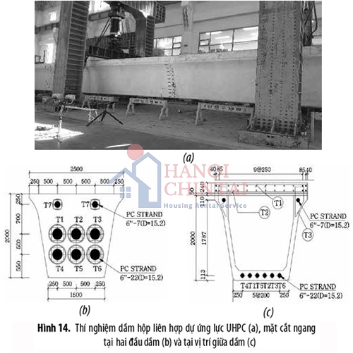 Hình 14a minh họa thí nghiệm kiểm tra khả năng chịu lực của dầm hộp ứng lực trước liên hợp UHPC. Dầm được sử dụng cho kết cấu cầu đường sắt tại Hàn Quốc [23]. Chiều cao của dầm là 2m, chiều rộng 2,5m. Tại vị trí hai đầu, dầm được bố trí 6 bó cáp ở phía dưới. Mỗi bố cáp gồm 22 thanh cáp có đường kính 15.2mm. Ở phía trên gồm 2 bó cáp, mỗi bó cáp gồm 7 thanh cáp đường kính 15.2mm, như thể hiện trên Hình 14b. Mặt cắt giữa dầm là dạng tiết diện hộp UHPC liên hợp với bản sàn bê tông cốt thép thông thường với chiều dày 240mm (Hình 14c). Thí nghiệm kiểm tra khả năng chịu lực của dầm được thực hiện tại Viện khoa học và Công nghệ xây dựng Hàn Quốc KICT, cho thấy khả năng chịu lực lớn nhất của dầm dưới thử nghiệm uốn bốn điểm là 5048,19 KN tương ứng với độ võng 444,8 mm. Hình 15 minh họa kết cấu dầm hộp dự ứng lực nhịp 72m dùng cho cầu đi bộ tại Busan, Hàn Quốc [24], được xây dựng vào năm 2022. Bản mặt cầu rộng 6m gồm 3 dầm hộp có chiều cao nhỏ nhất 0,75m và chiều cao lớn nhất 2,6m. Dầm gồm 5 phân đoạn với tổng trọng lượng 240 tấn. Mỗi dầm hộp có 24 sợi cáp với đường kính 15,2mm cho mỗi sợi cáp.