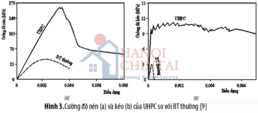 Hình 3 minh họa đường cong ứng suất biến dạng khi nén và kéo của UHPC so với bê tông thường [9]. Có thể thấy cường độ của UHPC khi nén và kéo cao hơn đáng kể so với bê tông thường. Biến dạng tỉ đối (strain) trong các mẫu thí nghiệm với UHPC khi nén có thể đạt tới 0.008 và khi kéo là 0.006. Ứng xử sau khi đạt đỉnh của UHPC cũng cho thấy sự khác biệt lớn so với bê tông thường, trong đó đường cong ứng suất-biến dạng thể hiện ứng xử dẻo (ductilebehavior). Ứng xử này liên quan chặt chẽ đến ma trận dày đặc và hàm lượng cốt sợi trong hỗn hợp của UHPC, giúp giảm tính giòn và tăng cường tính dẻo của bê tông.