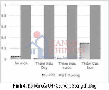 Hình 4 so sánh đồ bền của UHPC so với bê tông thường dưới tác động của các điều kiện thử nghiệm khác nhau (hệ số tỉ lệ lấy là 1 đối với bê tông thường) [10]. UHPC cho thấy độ bền vượt trội so với bê tông thường trong tất cả các trường hợp. Ví dụ, tỉ lệ chống ăn mòn của UHPC là 0.05 so với 1 của bê tông thường, tức là khả năng chống ăn mòn của UHPC cao gấp 20 lần so với bê tông thường.