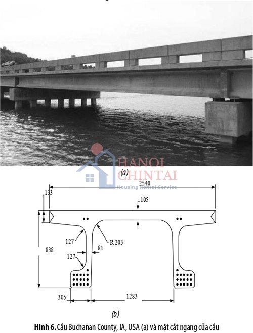 Hình 6a minh họa kết cấu cầu UHPC sử dụng dầm hình chữ pi được xây dựng ở Buchanan County, IA, vào năm 2008 [13]. Mặt cắt ngang, như thể hiện trong Hình 6b, tương tự như mặt cắt chữ T đôi nhưng có các mép dưới ở uốn cong ra phía ngoài. Dầm chữ pi có chiều cao 838m và chiều rộng 2540mm.