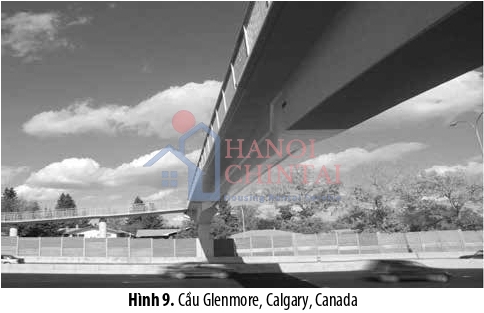 Hình 9 cho thấy cầu đi bộ Glenmore ở Calgary, Canada [16], sử dụng dầm dự ứng lực chữ T dài 33,6m. Dầm cầu bắc qua đường cao tốc tám làn xe mà không có bất kỳ trụ đỡ nào. Kích thước lớn nhất của dầm cầu là cao 1,10 m và rộng 3,60 m với 42 thanh thép dự ứng lực đường kính 15mm mỗi thanh.