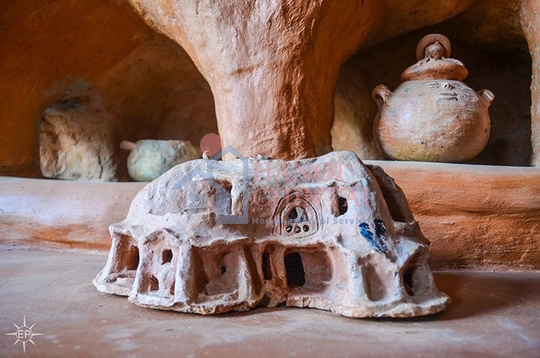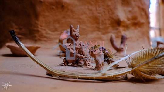 Giường ngủ bằng đất sét được trang trí những chi tiết như tranh, thảm, kệ sách.