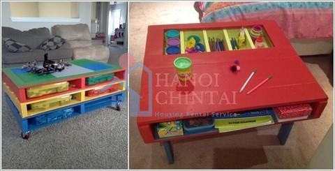 Chỉ cần đóng vài tấm pallet với nhau, sơn màu sặc sỡ là bạn đã một chiếc bàn rộng và nhiều ngăn để cho lũ trẻ vui chơi. Hoặc đơn giản hơn chỉ cần "tút tát" cho một tấm pallet rồi đóng chân cho nó cũng đủ biến tấm pallet thành chiếc bàn vẽ rồi đấy!
