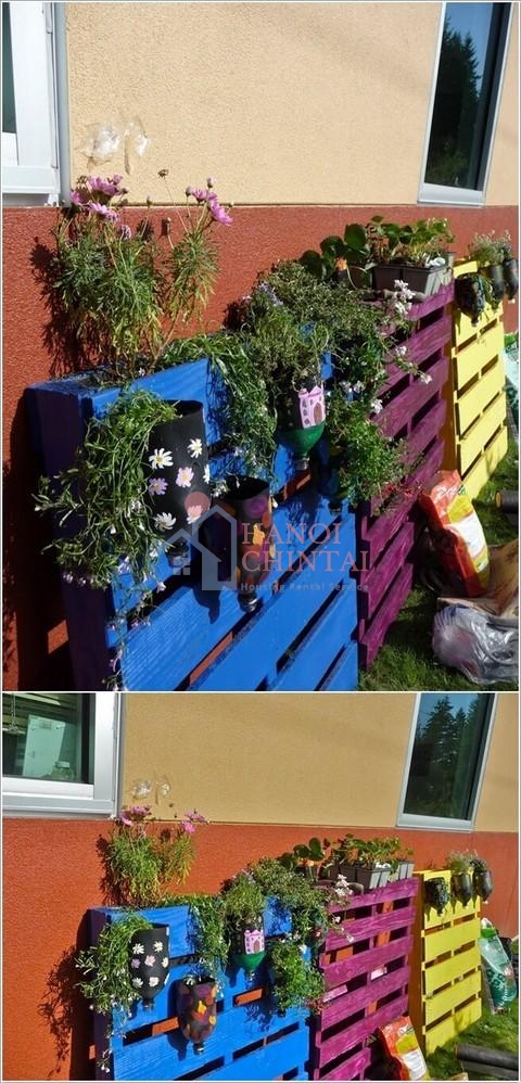 Bản thân kẽ hở giữa các thanh gỗ trong pallet cũng hoàn toàn lý tưởng để bạn treo lên đó những chậu cây, chậu hoa. Bạn thấy đấy, như trong bức tranh này thì chỉ vài tấm pallet gỗ, ít chai nhựa và chút khéo tay là bạn đã có ngay một khu vườn treo đẹp mắt.