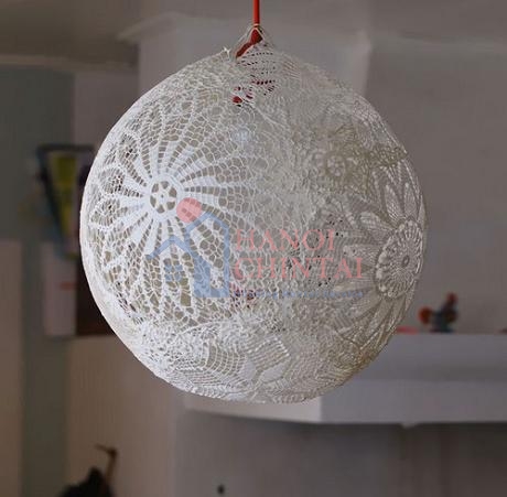 Tận dụng tấm khăn trải bàn cũ, phết lên đó một lớp keo mỏng để làm nó cứng lại, cắt tỉa bớt và cuộn lại thành hình cầu để có một bộ đèn đơn giản nhưng đẹp mắt. Khăn trải bàn có khá nhiều hình dạng có sẵn nên bạn sẽ không phải sáng tạo nhiều cho loại đèn này.