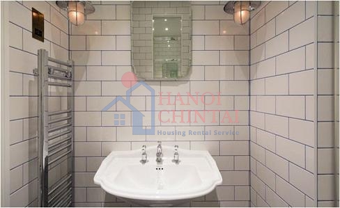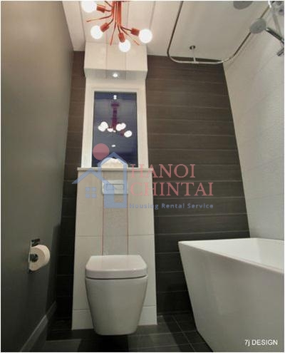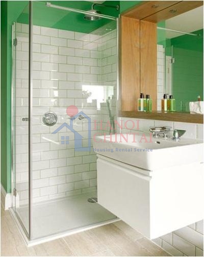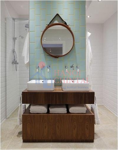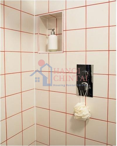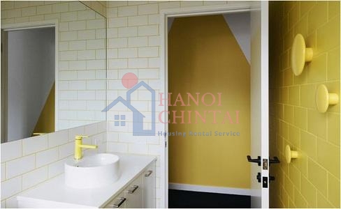 Các dọc kẻ màu đỏ to, rõ nét của xi măng màu tạo dấu ấn riêng cho căn phòng ốp gạch men màu trắng sáng bóng.