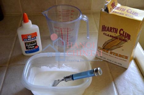 Bước 1: Trộn 1/4 chén nước, 1/2 chén tinh bột ngô và 1 chai keo sữa lại với nhau, khuấy đều sao cho hỗn hợp ở dạng sền sệt mà không quá lỏng. (chú ý: nếu không có bột ngô thì chỉ sẽ không cứng bằng nhưng không cần dùng bột ngô cũng được)