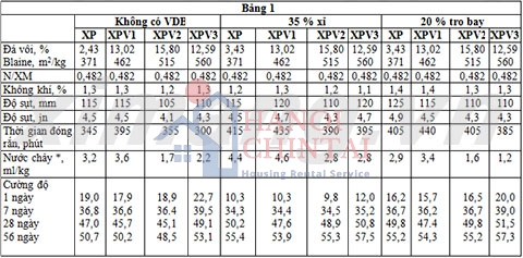 Bảng 1 trình bày từ một nghiên cứu của Canada, nơi có 12 loại xi măng khác nhau được tách thành ba nhóm: nhóm không có vật liệu đóng rắn bổ sung (VDB), nhóm với xi măng xỉ 35% và nhóm có tro bay 20%.