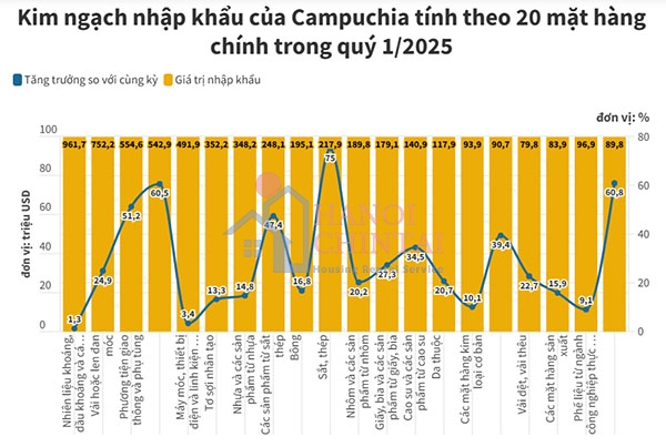 Tính chung trong 3 tháng đầu năm 2025, Campuchia đã nhập khẩu 217 triệu USD sắt thép, tăng 75% so với quý I/2024, chiếm 2,9% tổng kim ngạch nhập khẩu của nước này, ước đạt hơn 7,57 tỷ USD.